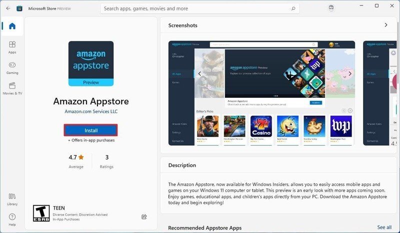 아마존 앱스토어 앱을 설치하려면 장치가 마이크로소프트 스토어 앱 버전 22110.1402.6.0 이상을 사용하고 있어야 한다.