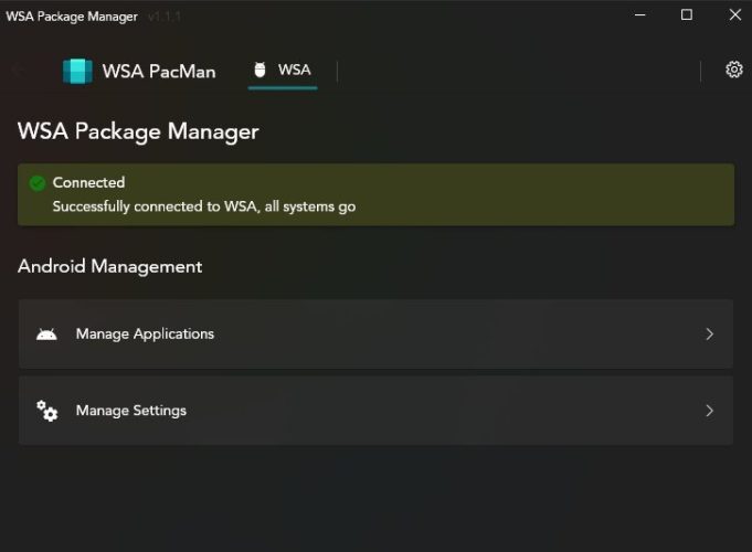 WSA-PacMan 자체를 실행하면 앱이 WSA에 연결되어 있는지 알려주는 기본 사용자 인터페이스와 WSA 설정을 열거나 설치된 애플리케이션을 관리하기 위해 누를 수 있는 버튼이 표시됩니다.