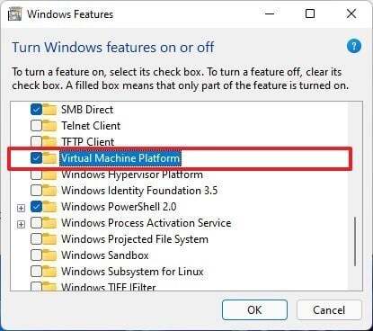 아직 수행하지 않은 경우 선택적 Windows 구성 요소에서 가상 머신 플랫폼을 활성화해야 할 수도 있습니다.Windows 기능 메뉴에서 확인란을 선택하거나 PowerShell에서 관리자로 이 명령을 실행하여 이를 수행할 수 있습니다.