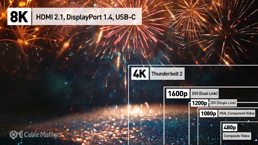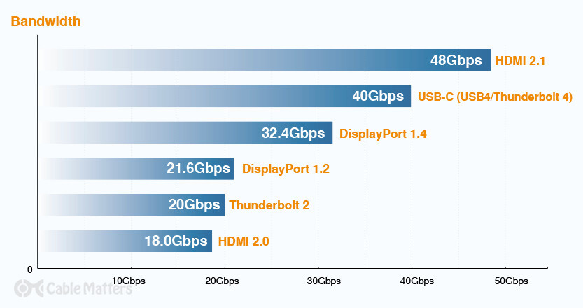 이에 비해 HDMI 2.1 및 DisplayPort와 같은 최신 커넥터는 그 이상으로 단일 연결을 통해 오디오와 비디오를 모두 전송할 수 있습니다. 또한 디스플레이 스트림 압축을 사용할 때 4K에서 높은 프레임 속도를 지원하거나 최대 16K 해상도에서도 낮은 프레임 속도를 지원합니다. 또한 HDR과 같은 최신 이미징 표준과 Dolby Atmos와 같은 최신 오디오 기능을 처리할 수 있습니다.