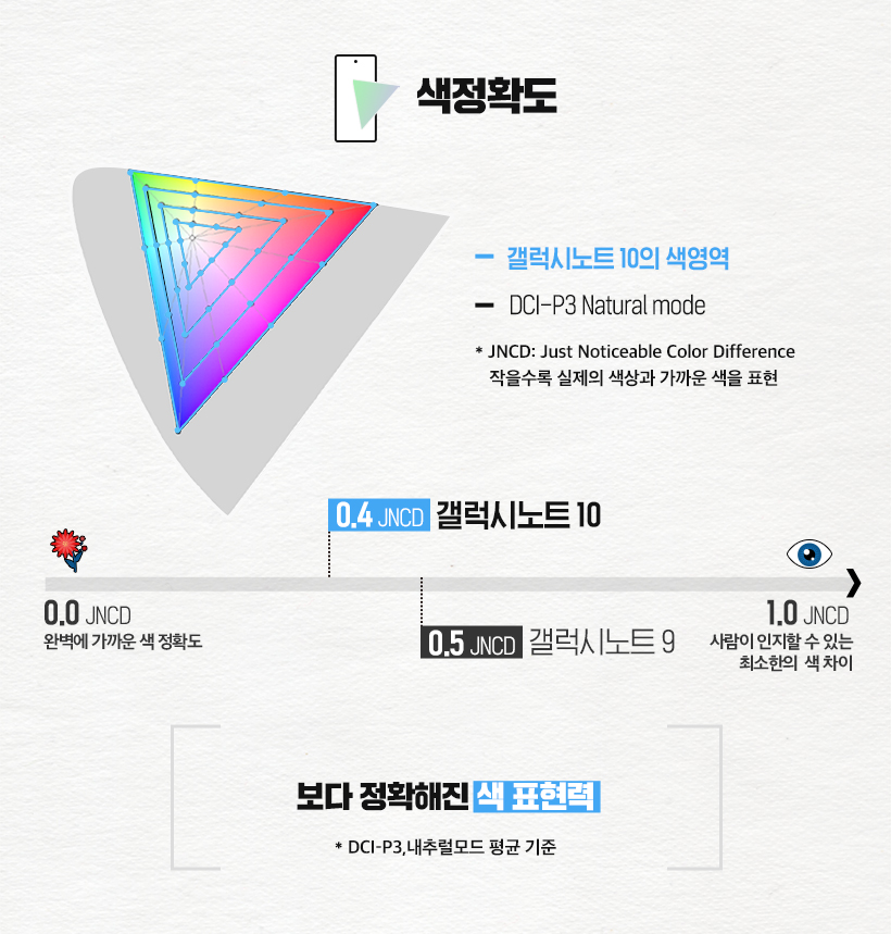 갤럭시노트10의 ‘색정확도’는 노트9의 0.5JNCD (0에 근접할수록 정확)를 넘어서는 0.4JNCD로 측정되었다. 0.4JNCD는 현존하는 스마트폰 디스플레이 중 가장 실제의 색상과 가까운 색을 표현하는 수준임을 의미한다.