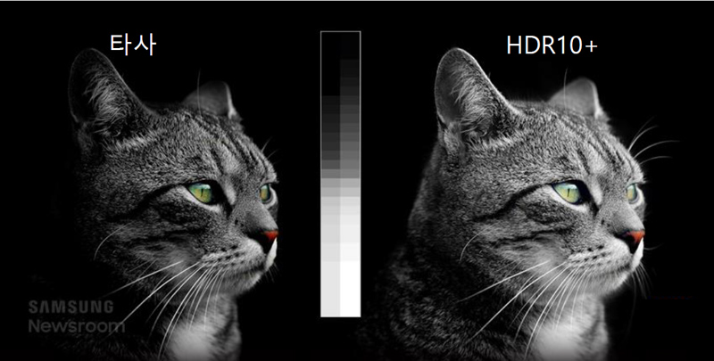3) HDR(High Dynamic Range) 은 고화질 고성능 영상 송출을 위해 명암비(Contrast Ratio, 가장 밝고 가장 어두운 부분의 비율)를 높여 영상 표현력을 더욱 세밀하게 하는 기술이다. HDR10+는 삼성전자가 개발한 차세대 초고화질 영상 표준 규격 기술로 파나소닉·20세기 폭스·아마존 등의 대표적인 TV 제조사·영화사·콘텐츠 제공사가 동맹을 결성해 대세 규격으로 확장해 가고 있다.