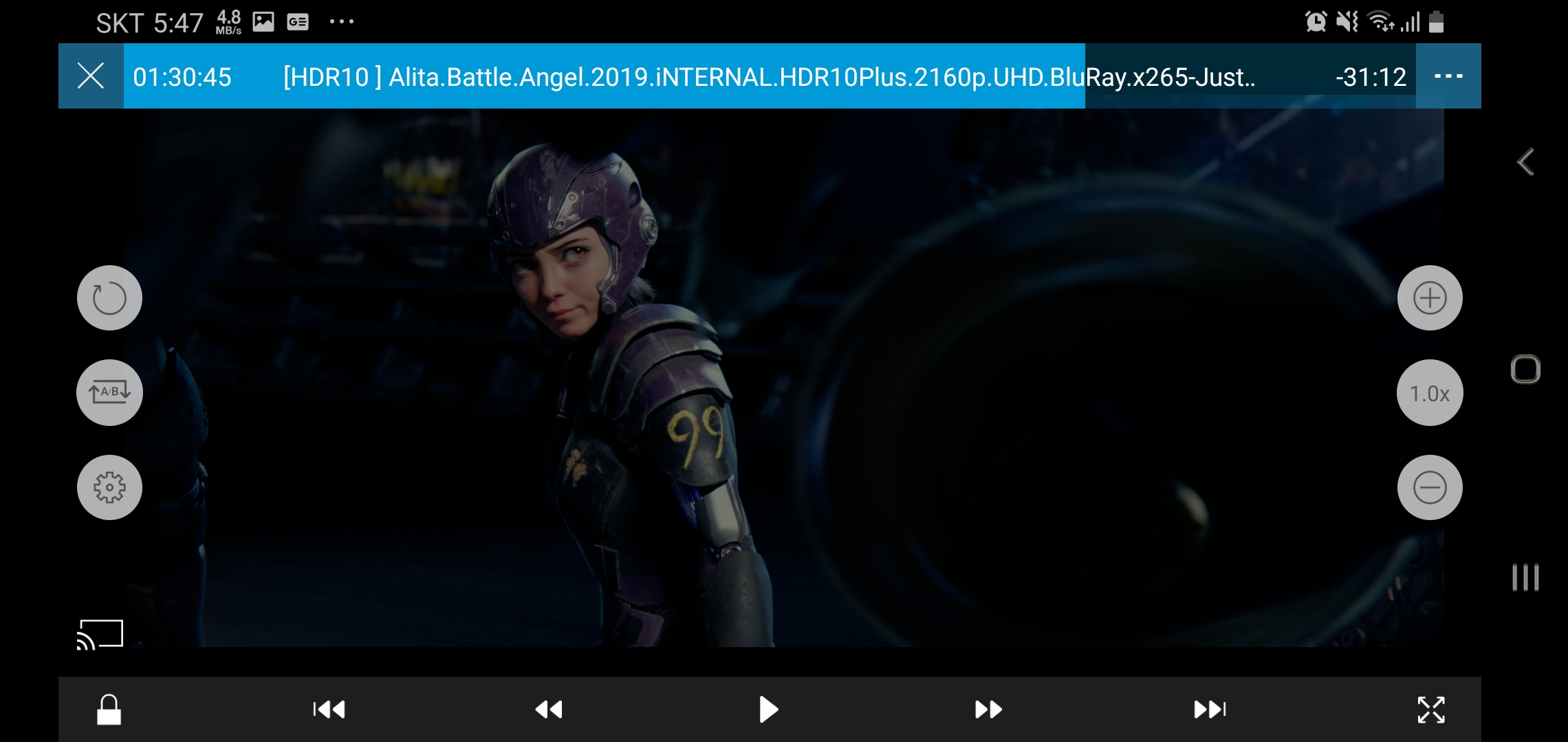 4) X맨 다크피닉스 HDR10+ 영상 재생입니다. 역시 캡춰로인해서 HDR10+의 효과는 정상적으로 보실 수 없지만, 실제 노트10/10+에서 헤드셋의 파란 불빛이 엄청 밝게 보여지게 됩니다. ^^