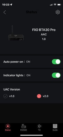 FiiO에서는 전용 앱으로 'FiiO Control'을 공개하고 있다. 본 기기와 스마트폰을 Bluetooth 연결한 후 앱을 시작하면 본 기기의 상태 및 기타 설정을 변경할 수 있다.