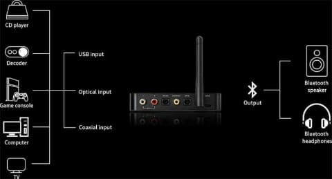 광 입력의 소스로 가장 큰 것은, TV일 것이다. 많은 텔레비전에는 사운드 바 접속용으로 광디지털 출력이 갖추어져 있어, 이것을 본 기기에 접속하는 것으로, 텔레비전 음성을 무선 이어폰으로 들을 수 있다.