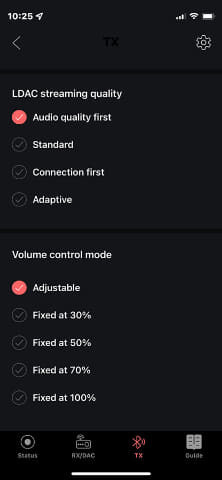 또한 송신기 모드 상태에서는 스마트 폰과 연결할 수 없지만 설정을 보낼 수 있습니다. 설정할 수 있는 것은 LDAC의 퀄리티 설정과 볼륨 모드이다.