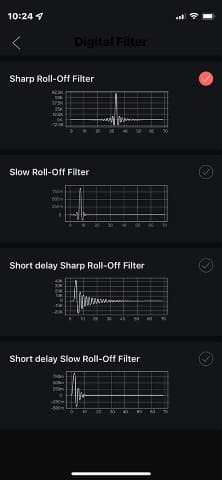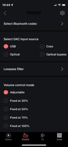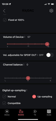 수신기와 DAC 설정은 공통이다. 설정할 수 있는 주요 항목은 코덱 옵션, 저역 통과 필터, 볼륨 모드, 좌우 밸런스, 업샘플링의 유무이다.