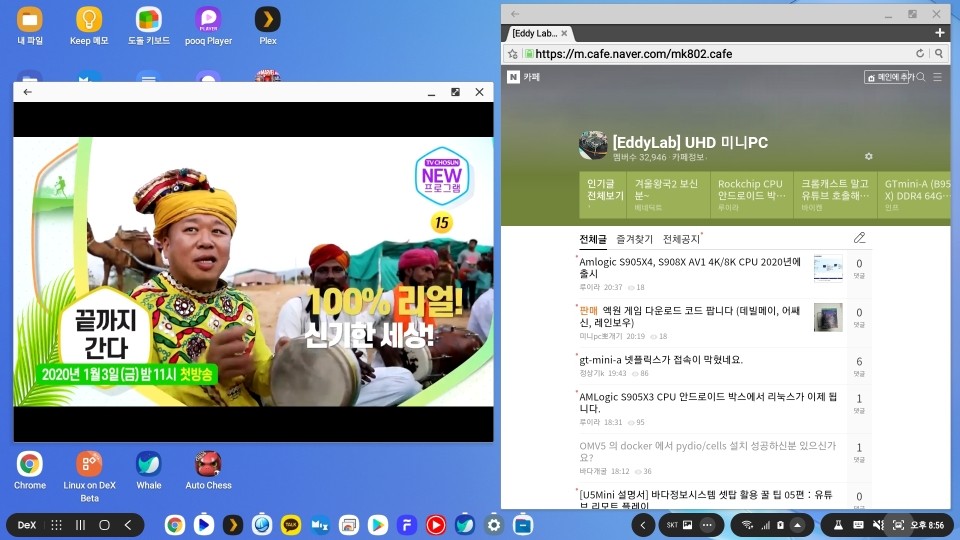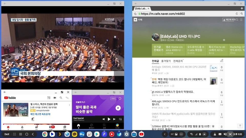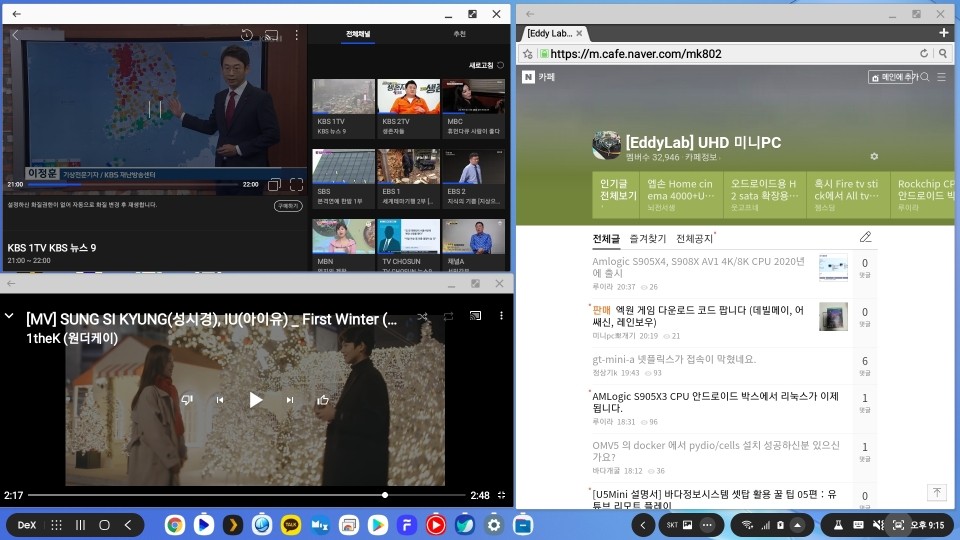 DeX의 멀티윈도우 기능을 이용하여. 여러개의 동영상 화면과