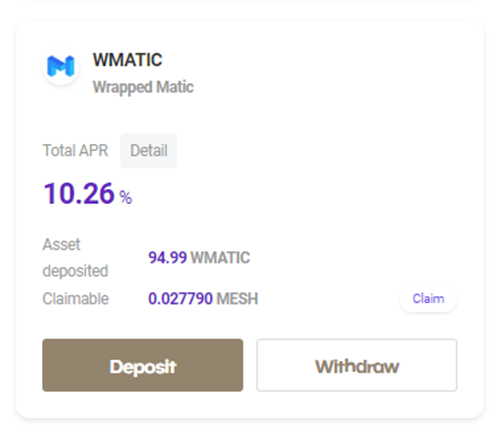 WMATIC 대여 풀에서 MATIC을 입금하면 이자와 MESH 보상을 받을 수 있습니다.