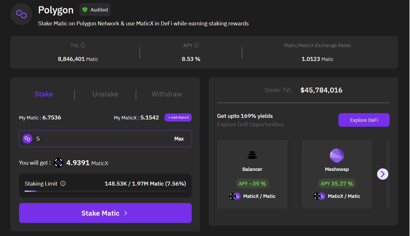 Stader의 dapp에 MATIC를 고정하는 대신 사용자는 고정 MATIC의 소유권을 증명하는 토큰인 MATICX를 취득한다.