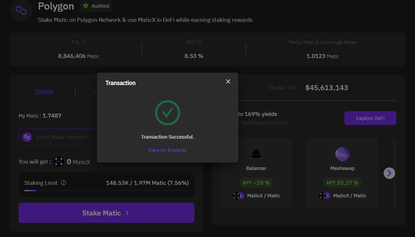 2. Stader에 투자하고 싶은 $MATIC 금액을 입력합니다.결정되었으면 "Stake MATIC" 버튼을 클릭합니다.또한 이 화면에서 $MATICX를 받을 수 있습니다.