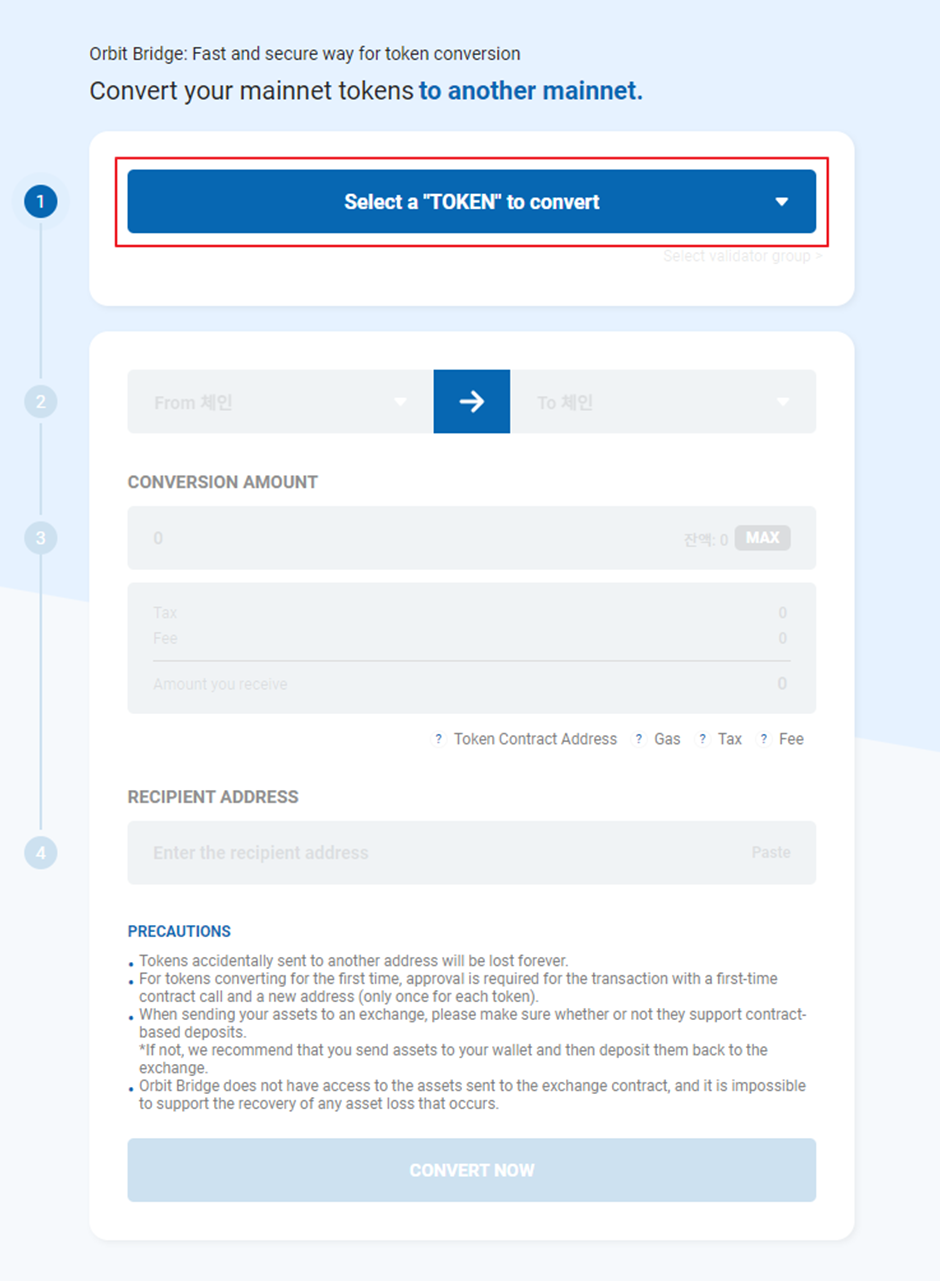 7. Orbit Bridge 웹 사이트로 이동하여 '변환할 토큰 선택' 버튼을 클릭합니다.