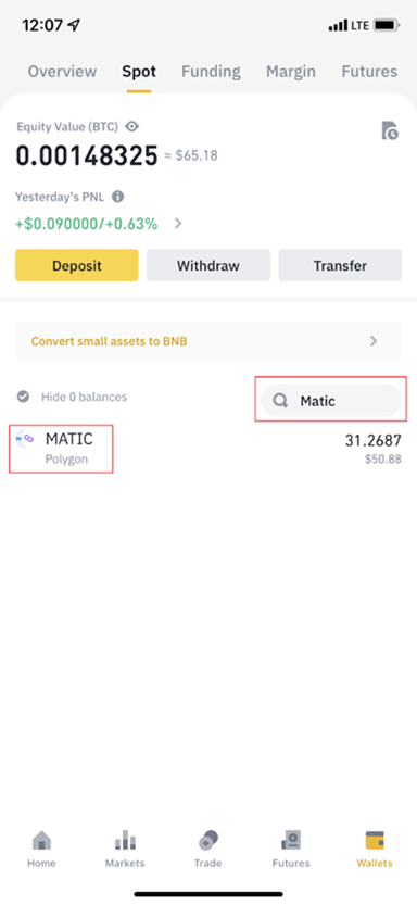 1. 바이낸스 '스팟' 페이지에서 MATIC를 검색하여 클릭합니다.