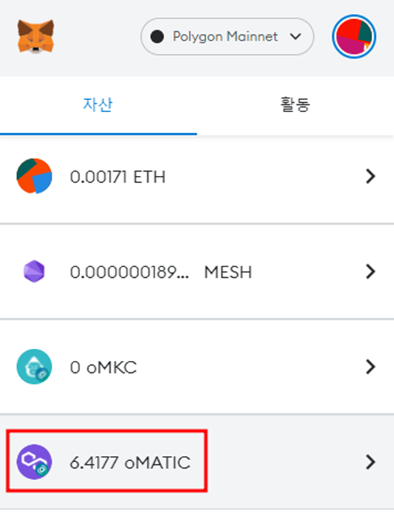 17. MetaMask 네트워크를 'Polygon'으로 설정하고 변환된 oMATIC(Polygon)을 확인합니다.