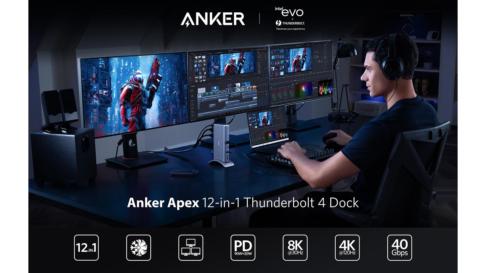 Anker Thunderbolt 4 12 in 1 Dock: Anker Apex 12 in 1 도킹 스테이션은 Thunderbolt 4 기술 덕분에 업계 최고의 사양으로 포괄적인 연결을 제공합니다. 최대 속도로 노트북에 전원을 공급하고, 동시에 최대 3개의 모니터를 연결하고, 최대 40Gbps(초당 기가비트)의 총 대역폭 덕분에 최대 속도로 파일을 전송할 수 있습니다.