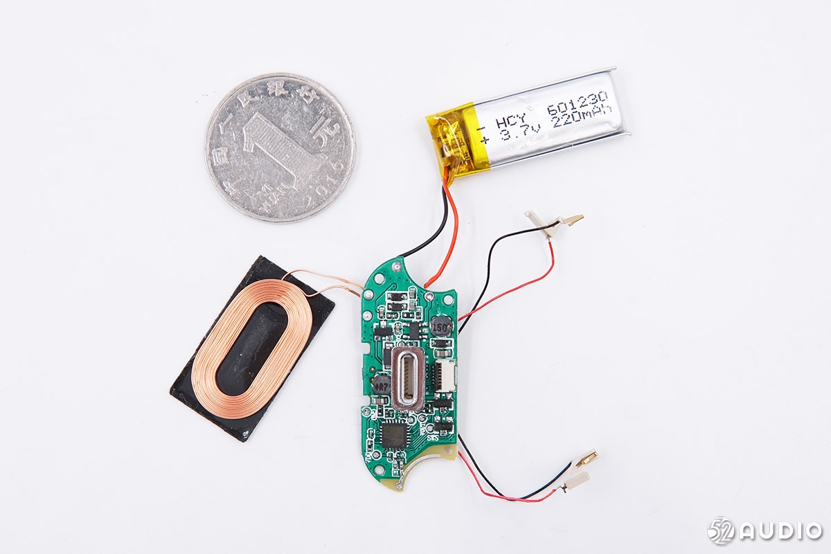 무선 충전 코일, 마더 보드, 배터리 및 1 달러 동전 비교.