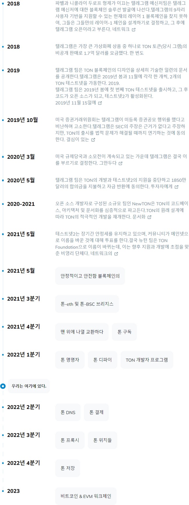 톤은 출범 이후 5년간 놀라울 정도로 진화해왔고, 여전히 범용 블록체인 기술의 최첨단을 달리고 있습니다. 2017년부터 톤 백서에서 제안한 아키텍처 접근 방식의 효율성은 지난 몇 년 동안 개발된 톤 기술 구현을 기반으로 한 다양한 테스트넷 및 메인넷의 입증된 고성능으로 더욱 검증됐습니다. 톤 공식 홈페이지의 블록체인 분석에 따르면 설계 및 구현 측면에서 이더리움과 솔라나보다 우위에 있으며, 개발자와 커뮤니티의 높은 기대치를 충족할 수 있는 궁극적 해결책이 될 수 있다고 합니다.